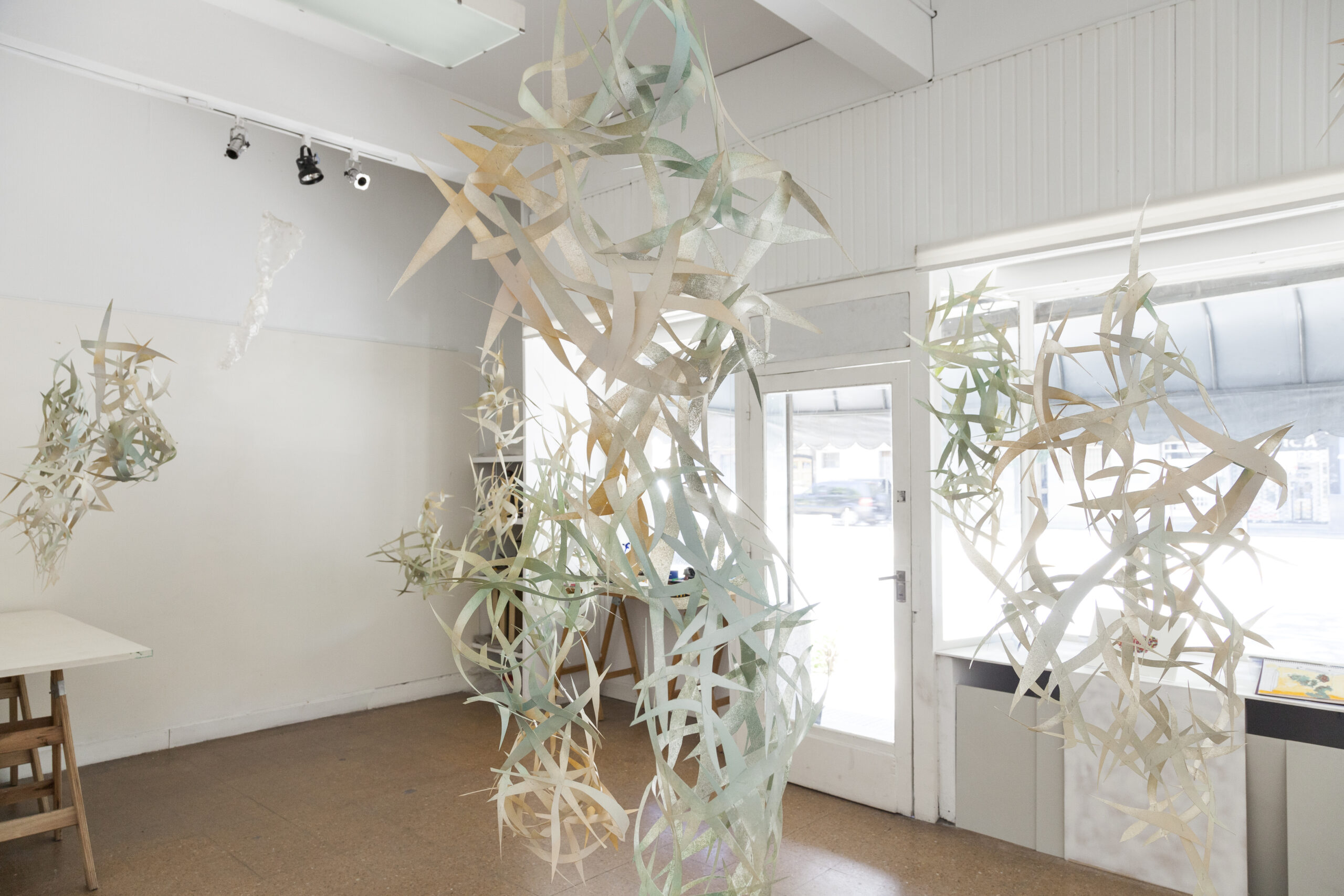 Colgué Aguas Inferiores en noviembre del 2020 en momentos de aislamiento aún, con la idea de que se vea sobre todo desde la vereda, pero utilizando el espacio completo. Mitze fue un encuentro, se movió mucha energía desde la primera vez que Juan visitó El Local y entendimos qué de eso se trataba: visitantes y locales. Estábamos cansados de la virtualidad, y la posibilidad de ver esculturas, tocar objetos y tener una charla en la vereda, terminó de ser ése el local que vende algo… pero no se sabe qué.