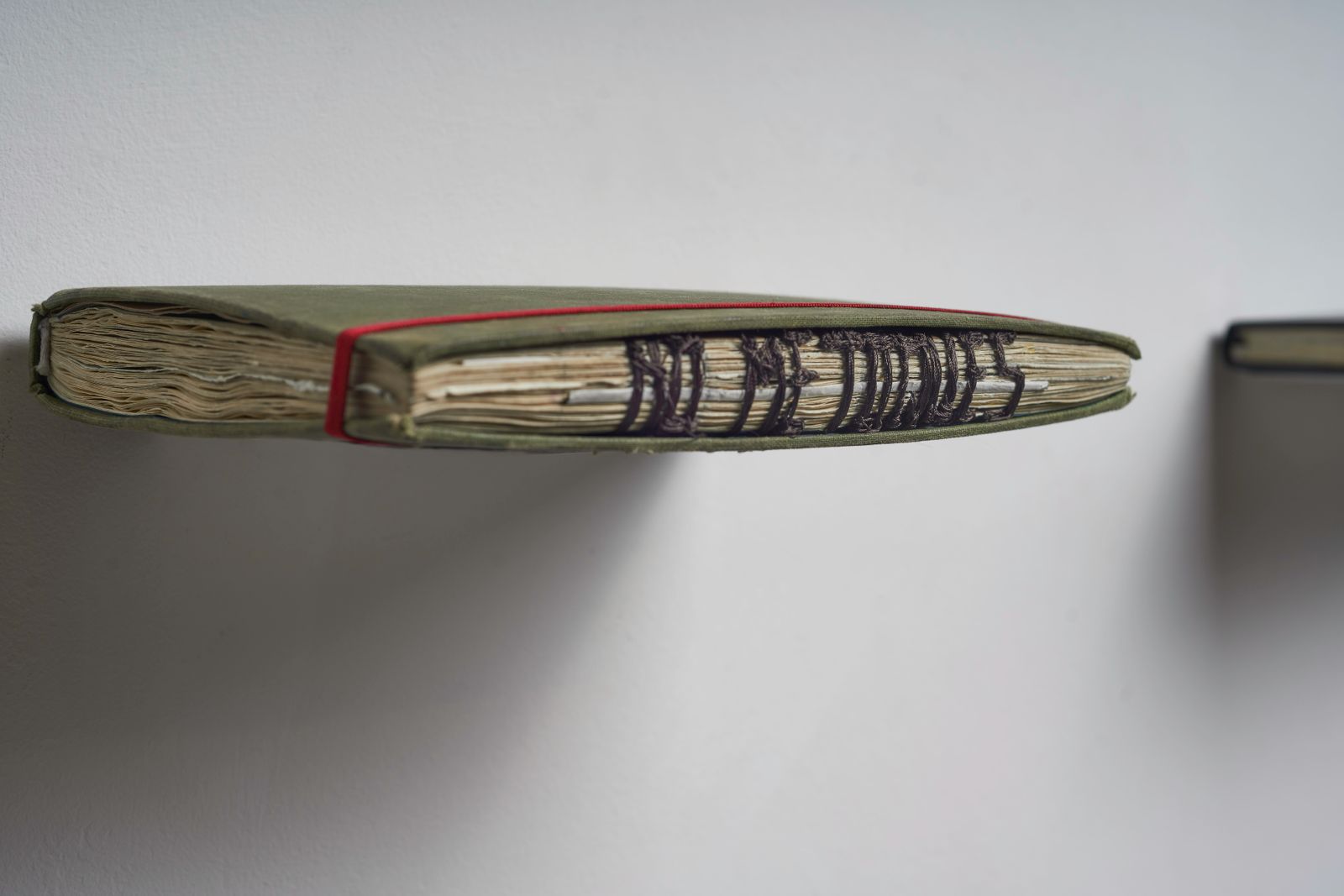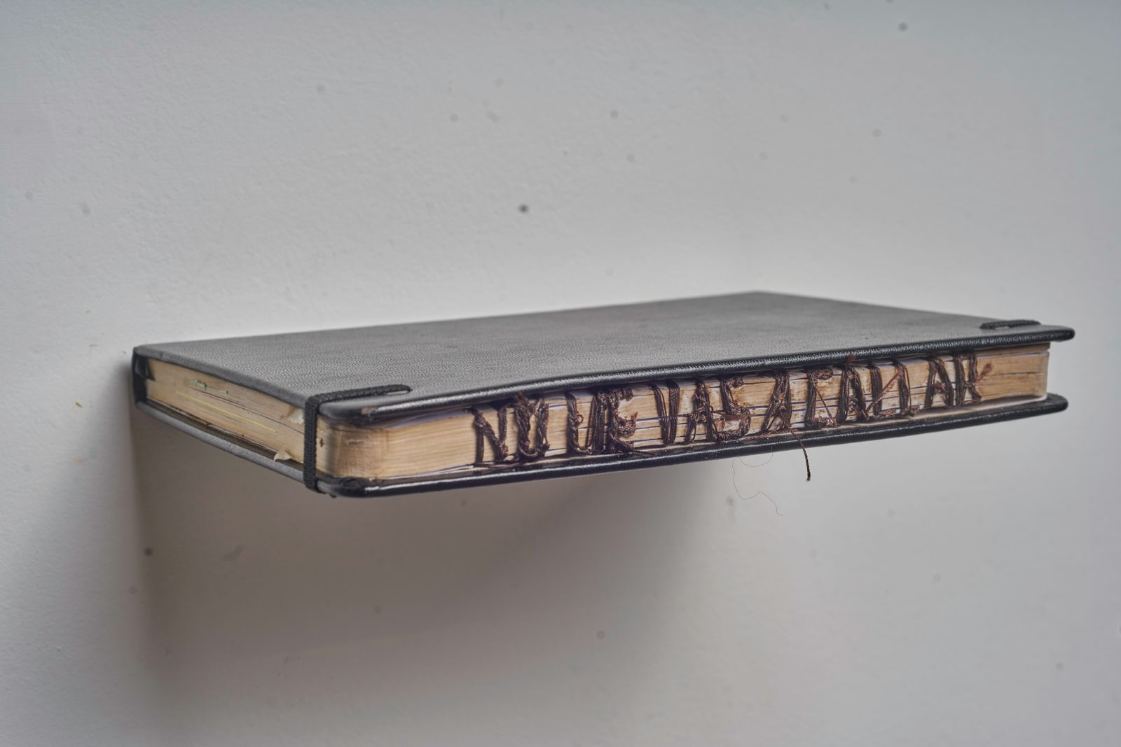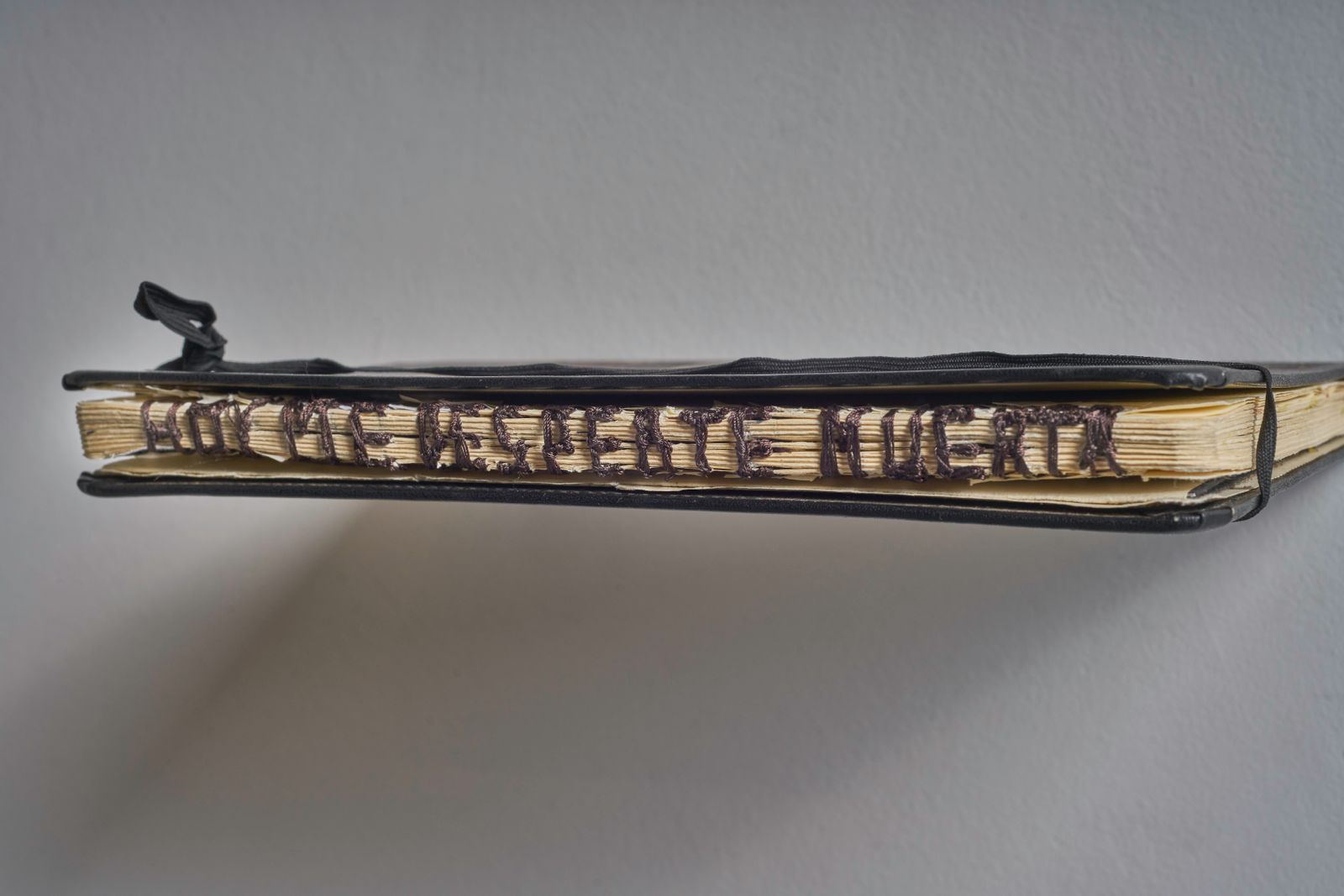 Schufer utiliza el acto de coser las páginas como una metáfora precisa y potente. Los hilos, lejos de reparar, conforman enunciados, otorgando cuerpo físico a las palabras. Esta elección no es casual: los hilos son, simultáneamente, el vehículo de la expresión y la imagen de la atadura. Visualizan lo difícil que resulta, en ocasiones, articular el dolor, la experiencia traumática o la denuncia. Cada puntada es un esfuerzo por verbalizar lo inefable, exponiendo la laboriosa, y a menudo dolorosa, construcción del relato. Hoy me desperté muerta es un recordatorio textil y poético de que, incluso en la fragilidad, el acto de contar y resistir son posibles.