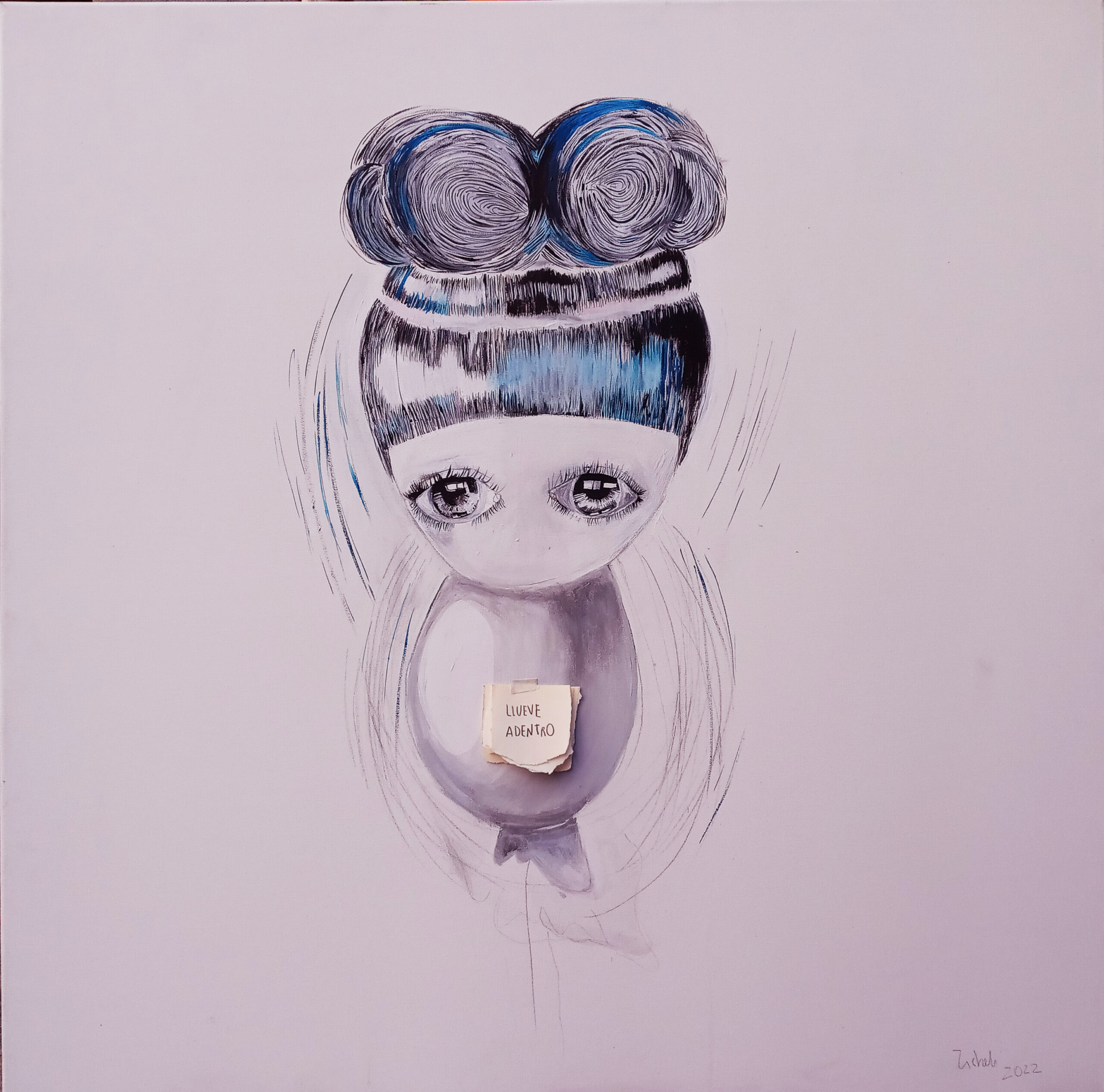 En esos dibujos y pinturas aparece algo muy íntimo, duro y frágil a la vez. La apariencia de los ojos de estos seres, en lugar de ocultar, confiesan un estado del alma: la melancolía. Un mensaje poético que hace referencia a las sombras que conviven en nosotrxs, una reflexión hacia lo interno, lo que no se ve. Estos retratos femeninos con sus cuerpos de fantasía se presentan exponiendo un modo de estar, casi levitando sostienen una quietud en el tiempo que parece eterna. Muchas veces me pregunto ¿Cuántas veces nos miramos a los ojos?