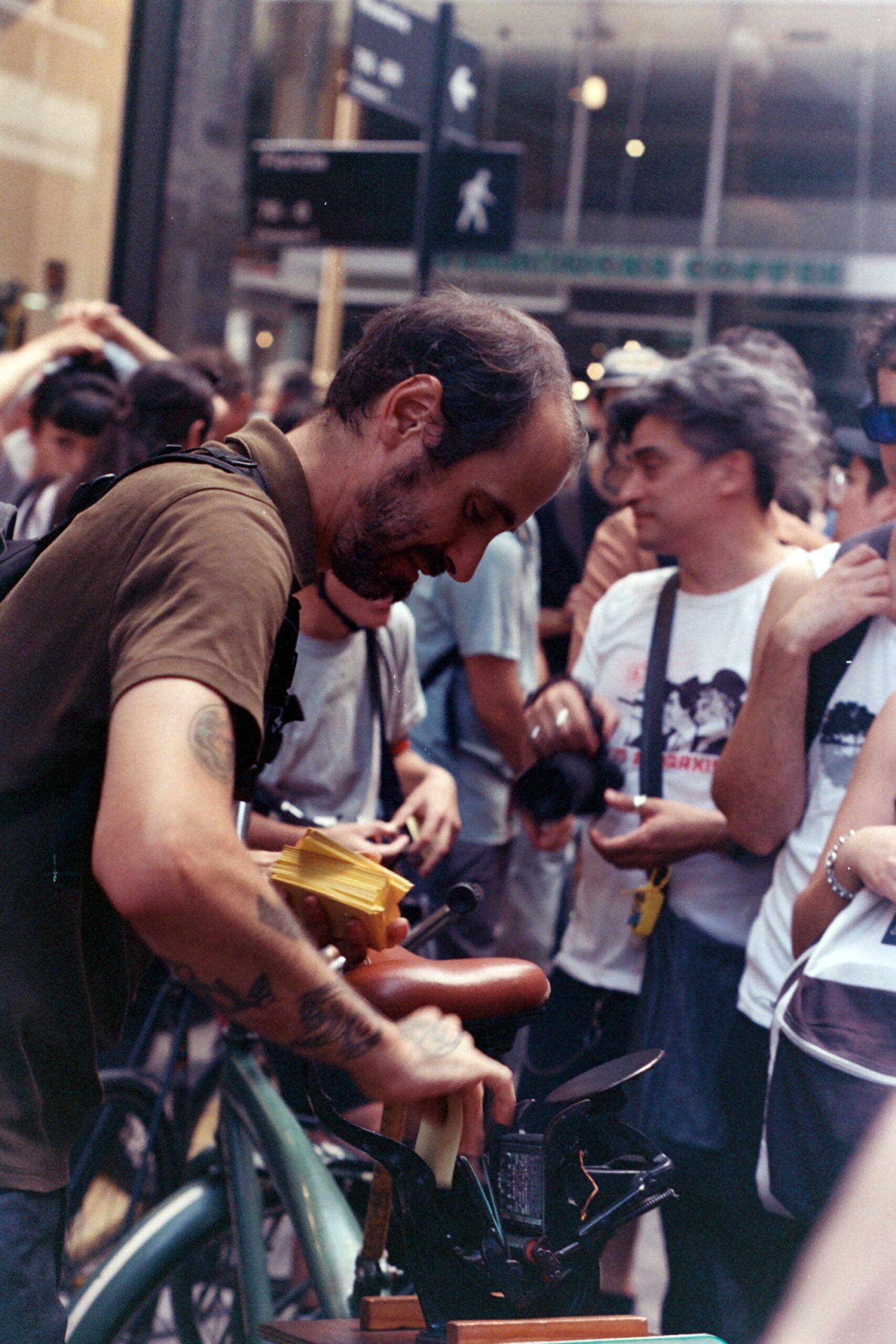 No, frenar no, en ningún momento. Tenía la determinación absoluta de hacerlo. Si hoy me preguntás si volvería a ese momento y lo haría otra vez, te digo que sí. Me interesa mucho más volcarme a ese tipo de cosas, porque con una acción generás todo esto, en lugar de salir y pegar cincuenta mil afiches. Es un desafío muy grande. Igual, sigo con mi bici-imprenta, que es otra vía, otra cosa. Es muy emocionante. Por ejemplo, el último 24 de marzo fue increíble. Ya hace desde el 2018 que voy siempre a una esquina puntual con la bicicleta y la imprenta chica e imprimo para todos los que quieran. La gente va y me cuenta que vino a ver si estaba. Eso es compartir un mensaje en pequeñas postales.