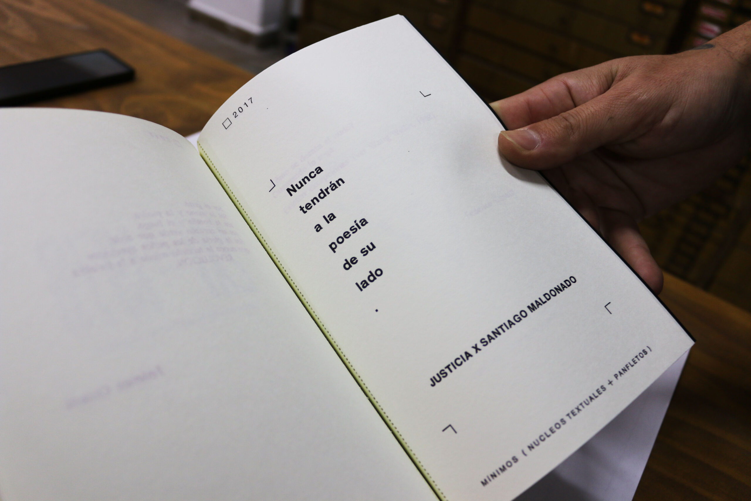 Ahora me pasa que agarro cosas que hice en el macrismo y lo veo ahora y da miedo. En el 2019, hice un libro de breves textos míos muy pequeños a los que llamo “núcleos textuales” más unos volantes. Agarro uno y es increíble como me retrotrae a ciertas cosas que imprimí en esos años. Hay volantes de la bici-imprenta como el de Telam, el del aborto que son vigentes. Hay uno de Santiago Maldonado, que me re acuerdo… Estaba en mi casa, en Caballito, y yo venía siguiendo mucho el tema. Milité mucho la causa. Me acuerdo que era un sábado que se supo que era Santiago Maldonado el cuerpo que habían plantado en el río. Dejé todo lo que estaba haciendo en mi casa y me fui a imprimir. Fue esa cosa urgente de necesitar salir de la casa. Ya lo tenía dando vuelta porque me pareció tan brutal y tan de un nivel de desolación, tremendo… y lo imprimí. Era eso dejar lo que uno está haciendo e imprimir. Imprimí una pila así y me puse a repartir.